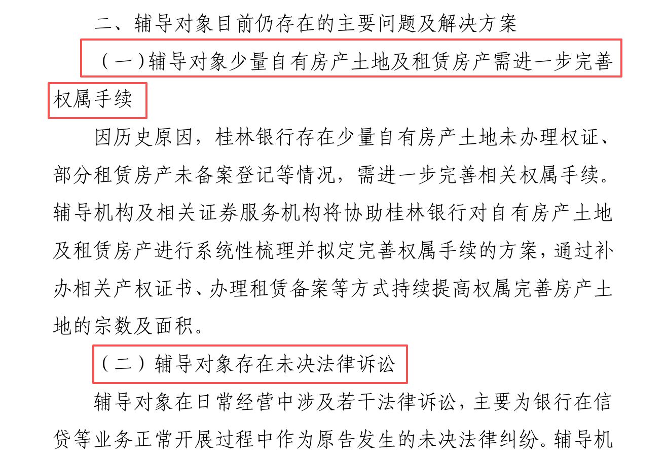 报告披露,桂林银行在2025年1-3月辅导期内存在的两大主要问题:一是因历史原因,桂林银行存在少量自有房产土地未办理权证、部分租赁房产未备案登记等情况,需进一步完善相关权属手续;二是桂林银行作为原告涉及若干未决的法律诉讼。