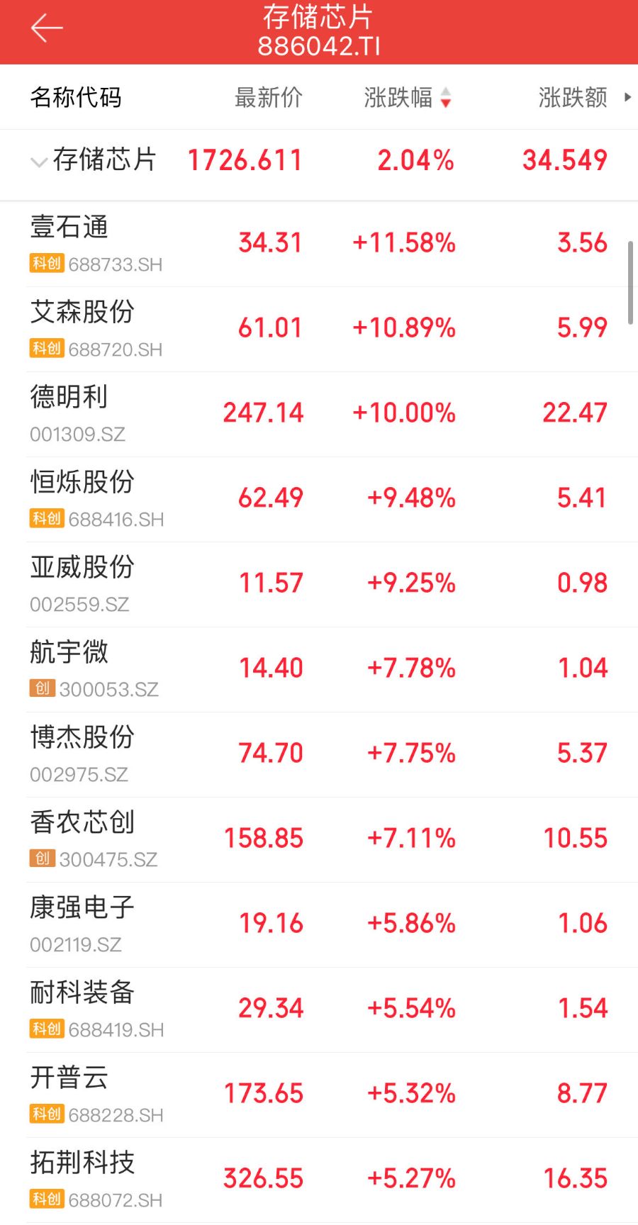 11月6日,A股存储芯片板块再度走强。截至午盘,壹石通(688733.SH)、艾森股份(688486.SZ)涨超10%,德明利(001309.SZ)强势涨停,香农芯创(300475.SZ)涨超7%,盘中股价最高触及163元/股,再创历史新高,康强电子(002119.SZ)、开普云( 688228.SH)、江波龙(301308.SZ)等多只个股跟涨。