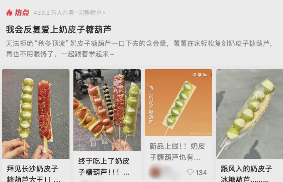 小红书上,关于“奶皮子糖葫芦”的笔记已过万,话题多次登上小红书热搜榜榜一。