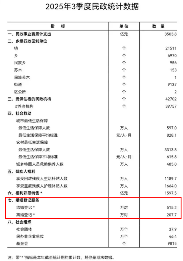 民政部发布最新的婚姻登记数据,2025年前三季度,全国结婚登记515.2万对,离婚登记207.7万对。和2024年前三季度相比,分别增加40.5万对、11万对。