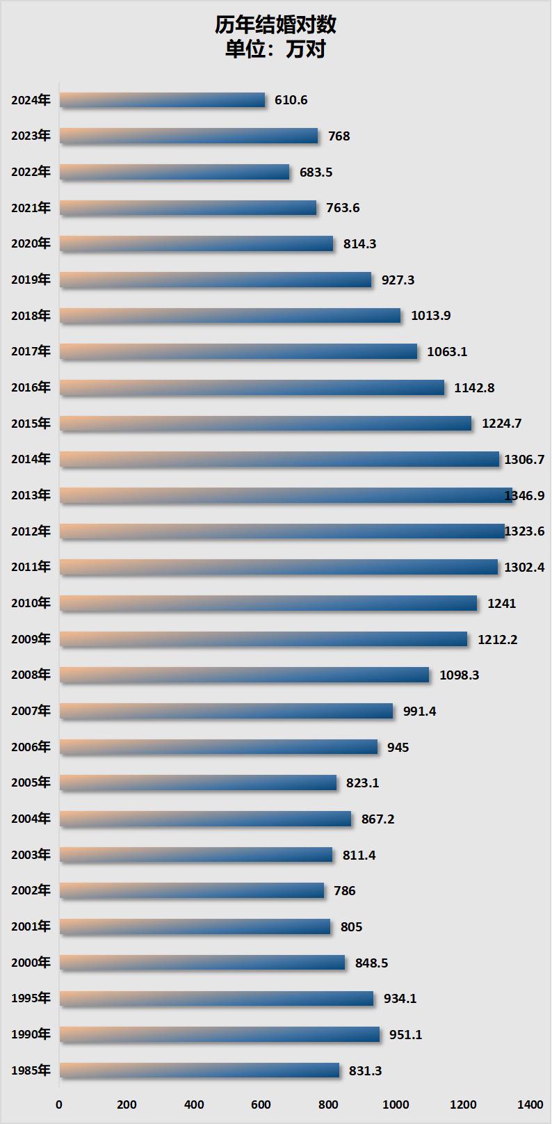 我们都知道结婚人数从2014年开始,连年下滑。2023年因为疫情后的补偿性结婚潮,结婚登记对数大增84.5万对。结果没想到2024年立即拉垮,竟然减少了158万对。