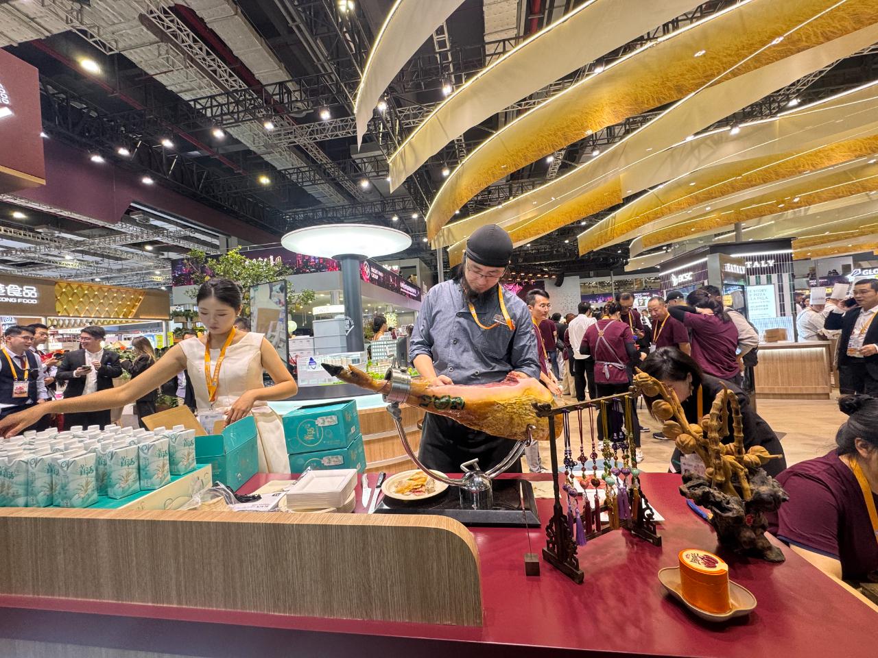 农食产品展区西班牙大火腿亮相。(中国商报记者 周子荑/摄)