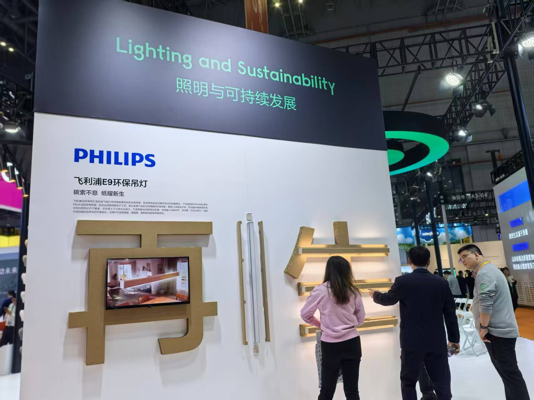 昕诺飞展示最新的“飞利浦E9环保吊灯”,其灯壳60%材料由纸制作而成。(中国商报记者 于佳鑫/摄)