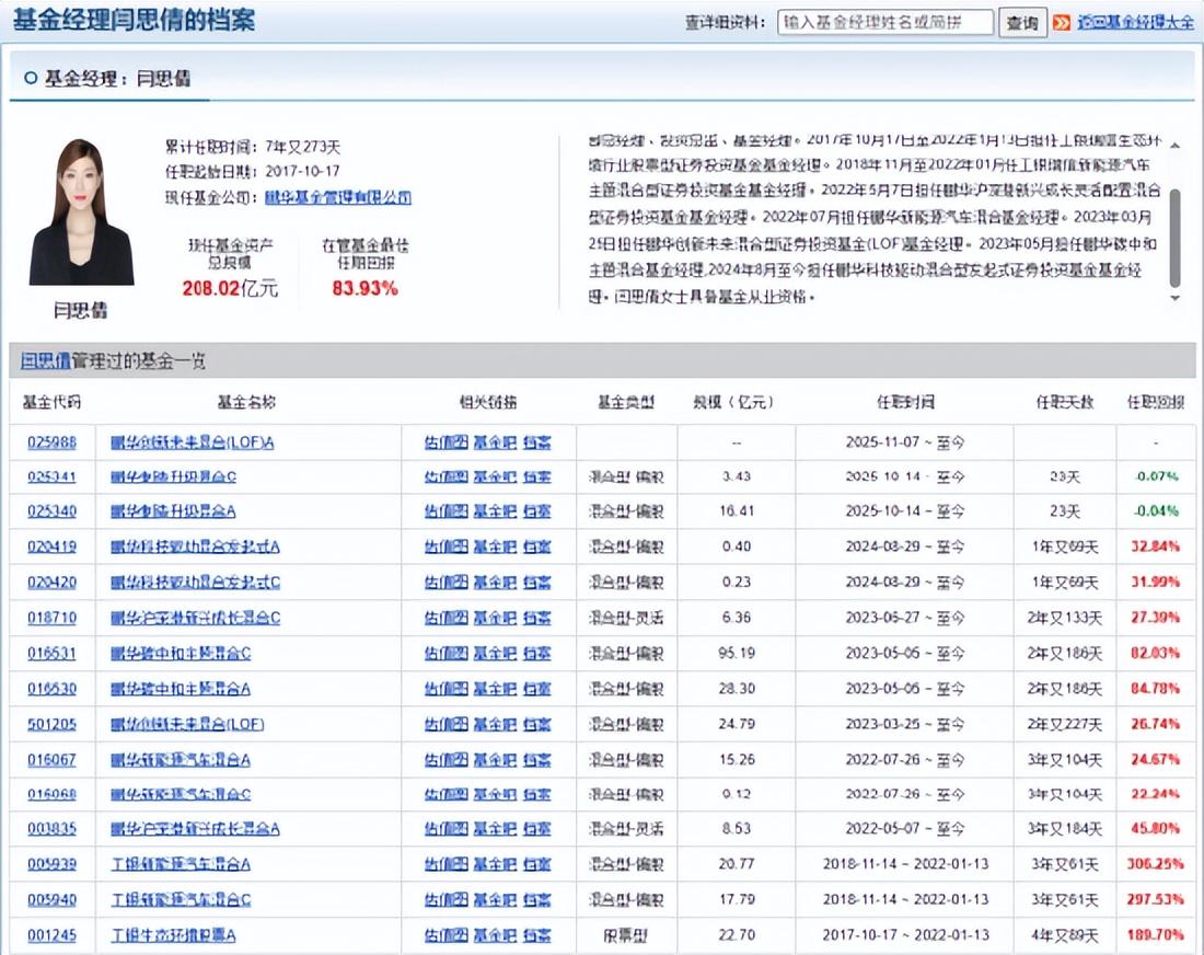 资料显示,闫思倩女士:中国国籍,硕士,曾任华创证券分析师,中银国际证券业务经理,工银瑞信基金研究部基金经理。2022年1月加盟鹏华基金管理有限公司,现担任权益投资三部总经理、投资总监、基金经理。2017年10月17日至2022年1月13日担任工银瑞信生态环境行业股票型证券投资基金基金经理。2018年11月至2022年01月任工银瑞信新能源汽车主题混合型证券投资基金基金经理。2022年5月7日担任鹏华沪深港新兴成长灵活配置混合型证券投资基金基金经理。2022年07月担任鹏华新能源汽车混合基金经理。2023年03月25日担任鹏华创新未来混合型证券投资基金(LOF)基金经理。2023年05月担任鹏华碳中和主题混合基金经理,2024年8月至今担任鹏华科技驱动混合型发起式证券投资基金基金经理。闫思倩女士具备基金从业资格。