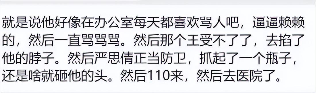 11月6日消息,网传近日鹏华基金旗下两位基金经理,闫思倩与王子建发生互殴。根据网传截图显示:闫思倩在办公室骂骂咧咧,王子建受不了了,去掐了他的脖子,然后严思倩正当防卫,拿烟灰缸或者瓶子,打了王子建的头,然后报警、送医院了。