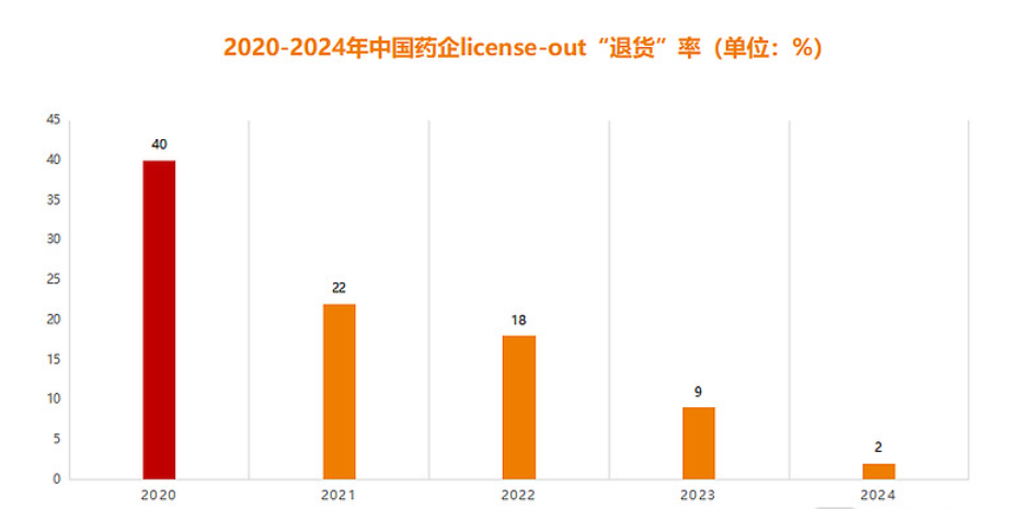 据动脉网统计,2020年的62起License-out交易中,截至2025年4月20日有25起明确终止合作,退货率高达40%,且2021年、2022年的License-out交易的退货率都在20%左右。