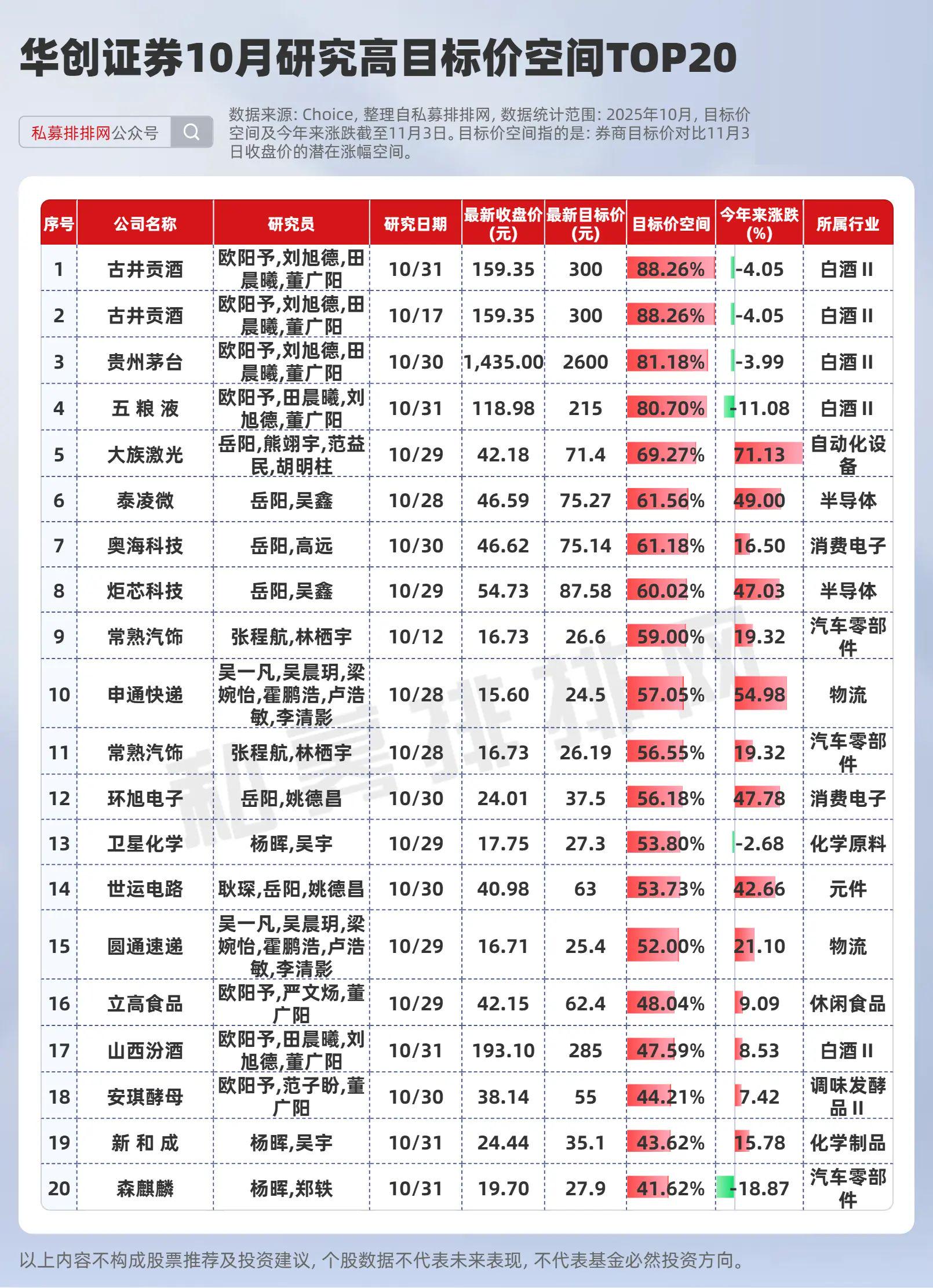 Choice数据显示,10月份华创证券对A股77家上市公司给予研究覆盖,整体研究方向更侧重于白酒股,其中目标价空间在50%以上的个股有15只。目标价空间位居前三的均为白酒股,分别是:古井贡酒、贵州茅台、五粮液。