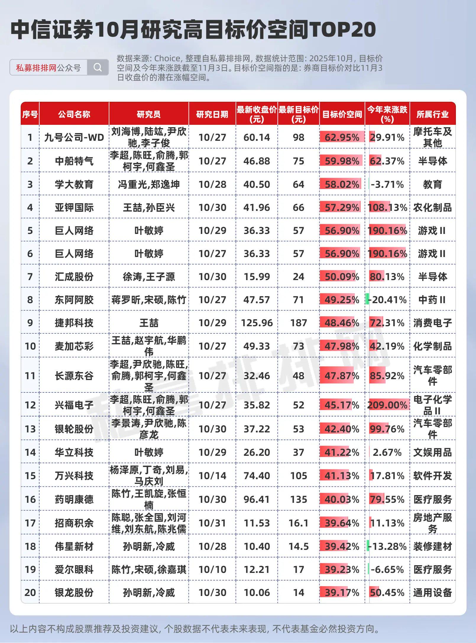 此外,中信证券10月份覆盖的196家上市公司中,目标价空间最高的三只个股分别是九号公司-WD、中船特气、学大教育。其中九号公司-WD被给予98元目标价,目标价空间高达62.95%。