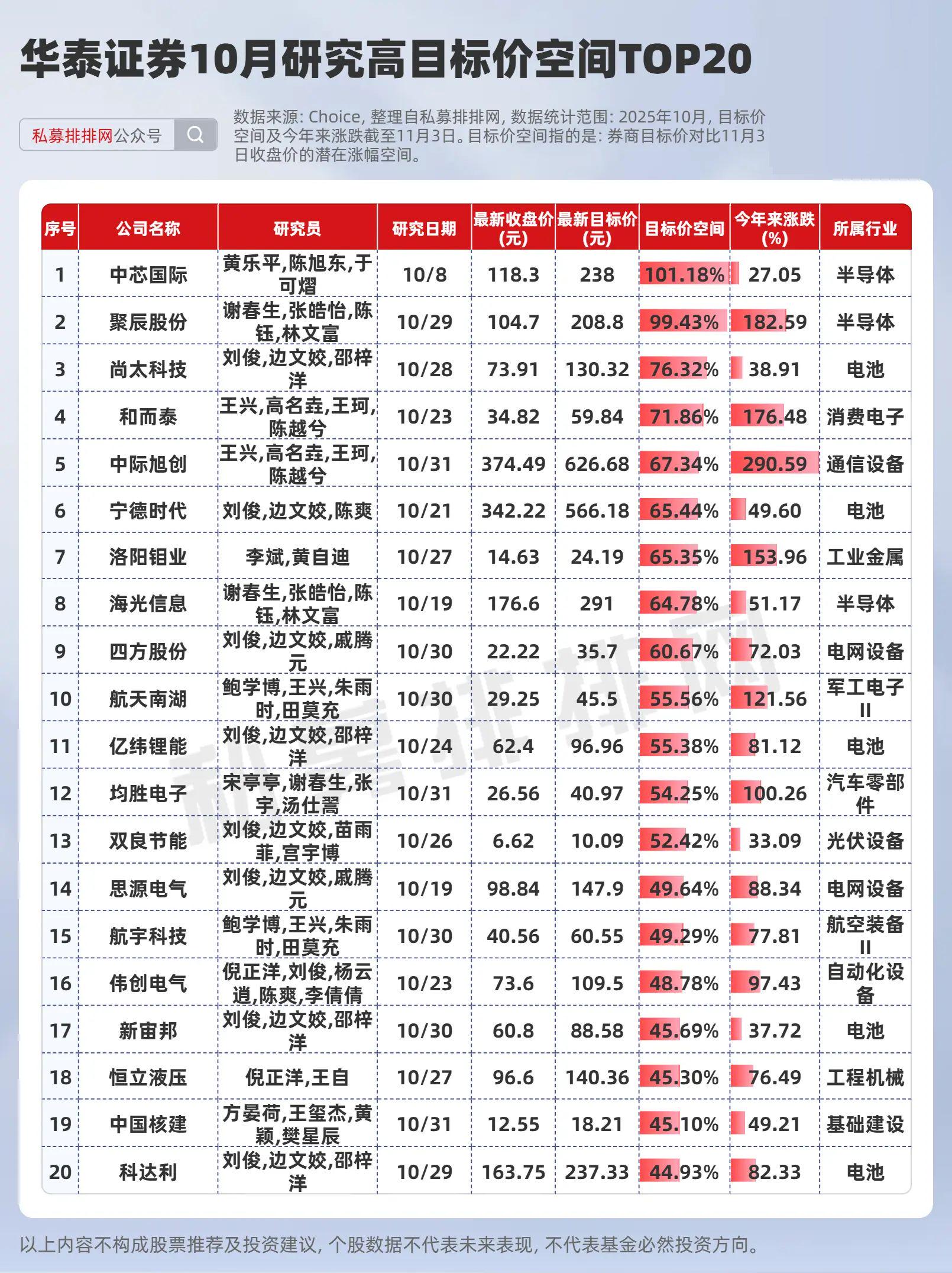 Choice数据显示,10月份华泰证券对A股434家上市公司给予研究覆盖,其中目标价空间在50%以上的个股有13只,且多为科技股。目标价空间位居前三的分别是:中芯国际、聚辰股份、尚太科技。