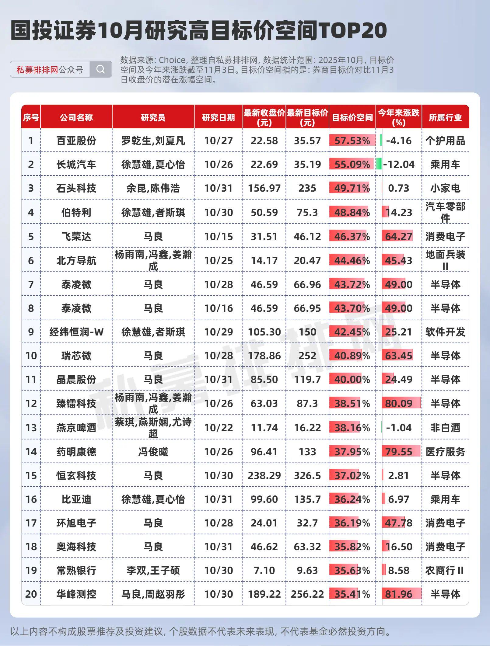 Choice数据显示,10月份国投证券对A股108家上市公司给予研究覆盖,整体研究方向更侧重于汽车零部件、半导体、医疗器械,其中目标价空间在50%以上的个股有2只。目标价空间位居前三的分别是:百亚股份、长城汽车、石头科技。