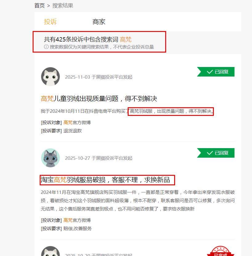 在黑猫平台,包含高梵的搜索词有425条,其中不乏与产品质量和售后服务直接相关的投诉,另有线上消费者评价显示,高梵部分产品存在面料薄、跑绒、开线等问题。高端定位若缺乏与之匹配的品质&售后水平支撑,口碑的崩塌或只是时间早晚。
