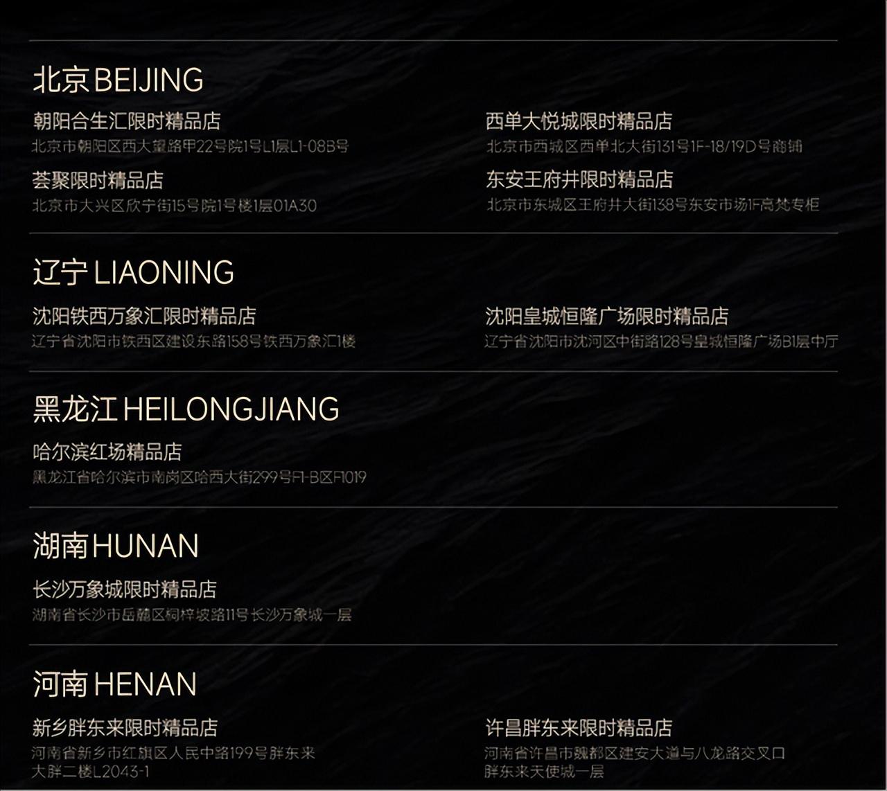 一个真正高端的品牌,必须还得是线上+线下两条腿走路,据官网资料,高梵目前完成了十余家线下门店的布局,北京4家、辽宁2家、黑龙江1家、湖南1家 、河南2家(分别为新乡胖东来和许昌胖东来限时精品店)