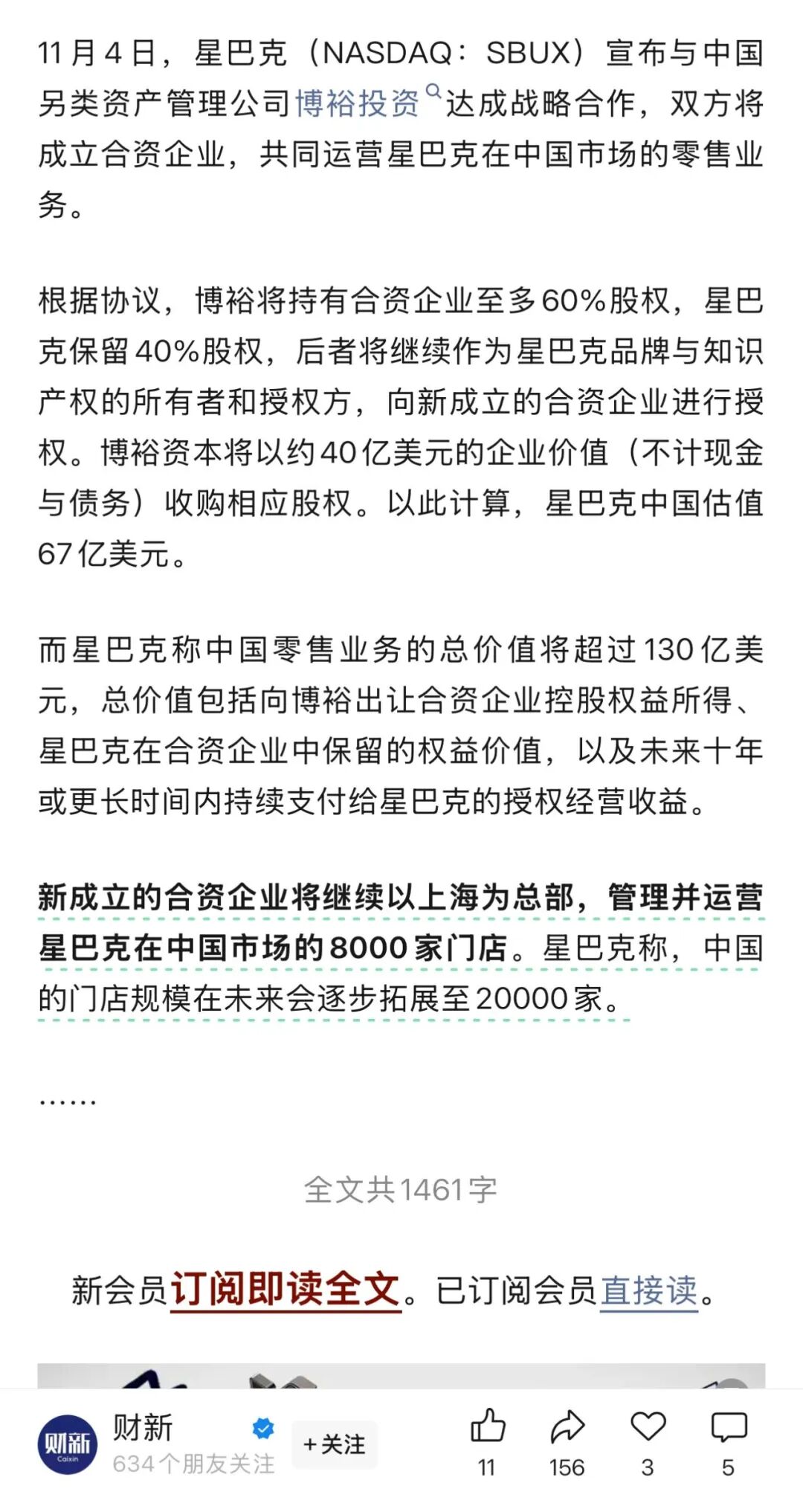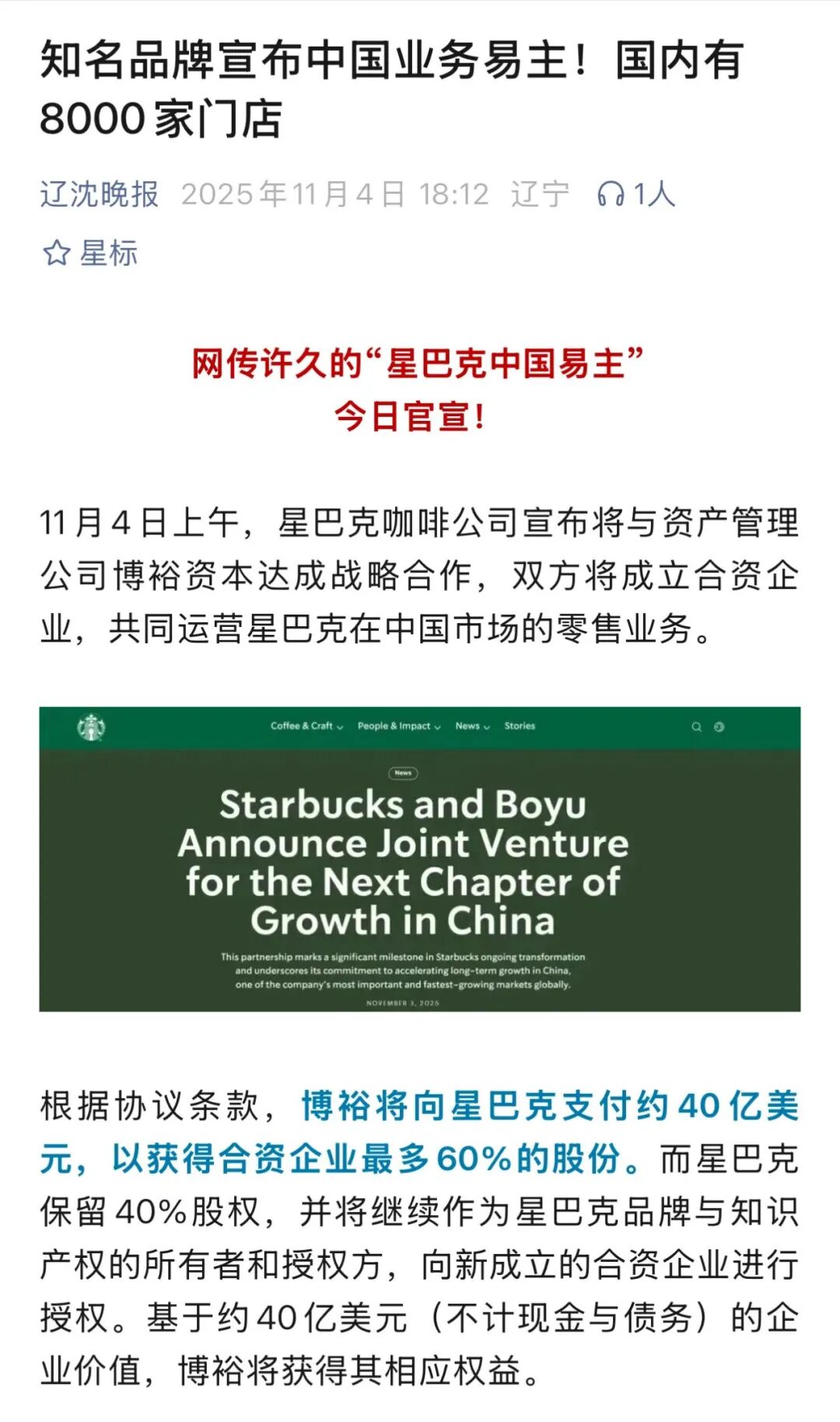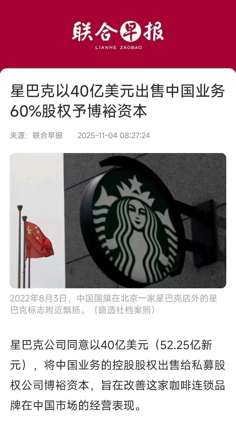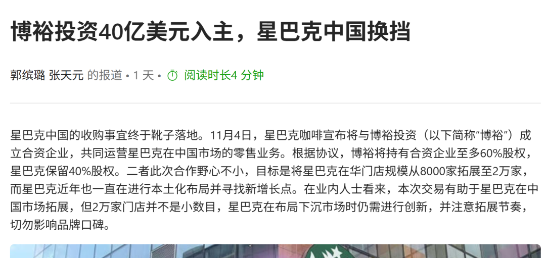 11月4日,星巴克中国官宣易主,新的合作方是博裕资本。按理说,这是本周最受关注的一桩消费资本事件。然而,在传媒见闻核对交易细节时,却发现了一个罕见的“集体乌龙”——不少主流媒体,都把星巴克中国的“卖身价”报错了。