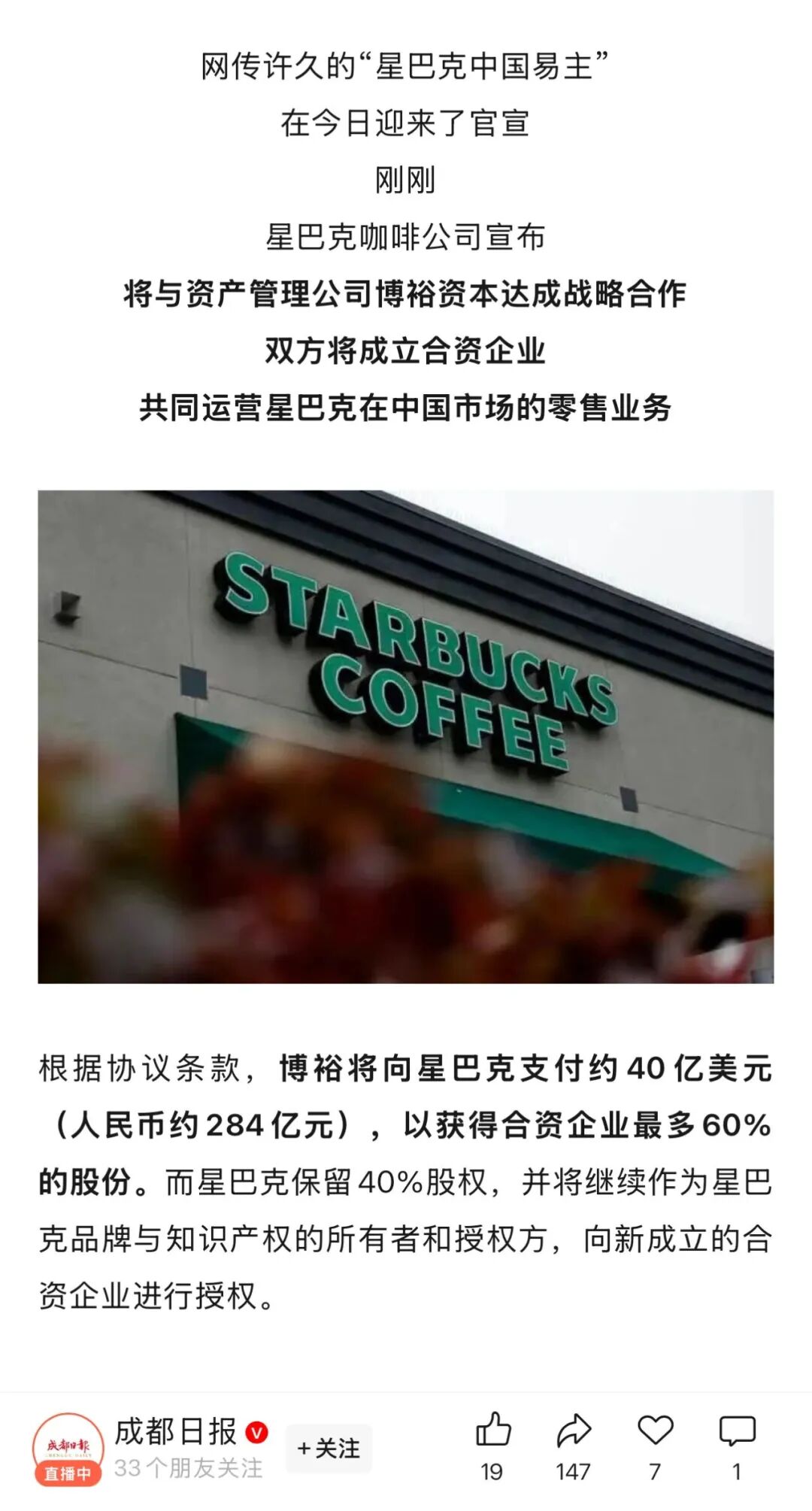 根据星巴克中国官方通告,星巴克与博裕资本将共同成立合资企业运营中国市场,合资公司整体估值为40亿美元,其中博裕资本持股60%。换句话说,星巴克此次出让的交易金额是24亿美元,而非40亿美元。