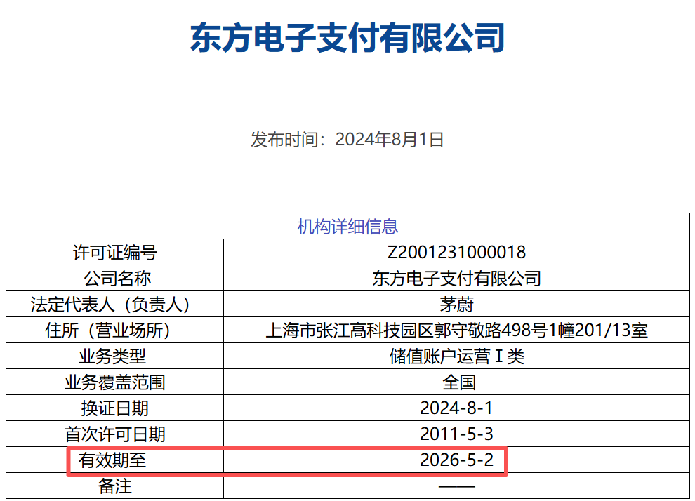 而据央行官网信息,其许可证有效期至2026年5月2日,业务类型为储值账户运营Ⅰ类。