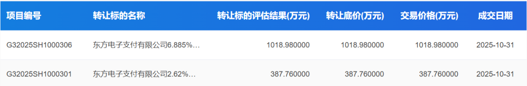 根据上海联合产权交易所公告,东方支付在10月31日完成两笔股权转让交易。