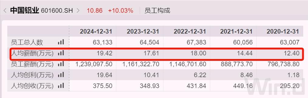 作为央企,中国铝业也解决了大量就业岗位。2024年末,公司职工总数大约6.3万人,比2023年末减少近1400人,去年人均创利大约19.6万元,人均税前薪酬19.4万元,比2023年增加1.8万元。