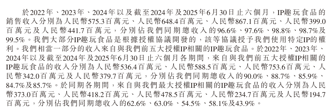 根据弗若斯特沙利文报告,2024年,按收入计,公司分别是中国最大的IP趣玩食品企业和中国第四大IP食品企业,市场份额分别为7.6%及2.5%。截至2025年上半年,公司也是中国拥有最多IP授权的IP趣玩食品企业。