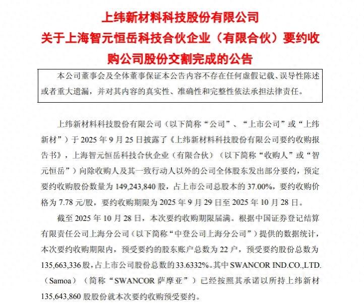 11月6日晚间,年内最大涨幅超20倍的科创板超级“大牛股”上纬新材(688585.SH)发布公告称,截至公告披露日,本次部分要约收购清算过户手续已经办理完毕,智元恒岳持有上纬新材2.36亿股股份,占上市公司总股本的58.62%,智元恒岳及其一致行动人共计持有上纬新材2.57亿股股份,占上市公司总股本的63.62%。