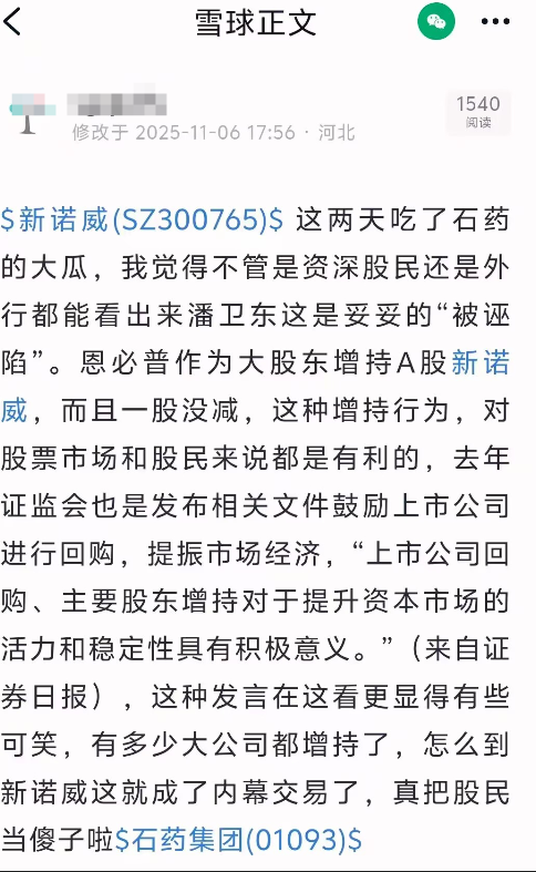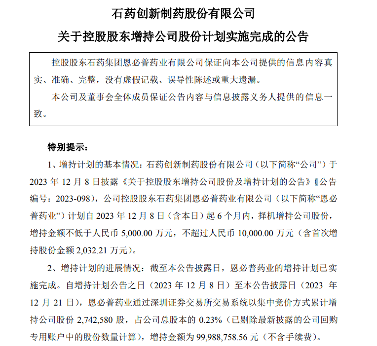 2023年12月8日新诺威发布公告,大股东恩必普(石药集团控股)要增持5000万到1个亿,12月21日新诺威公告,恩必普通过深交所交易系统以集中竞价方式累计增持公司股份274万股,增持金额为99,988,758.56元。于新诺威公告来看,增持的股票为恩必普公司持有。令人费解的是怎么可能是潘卫东个人持有股票呢?