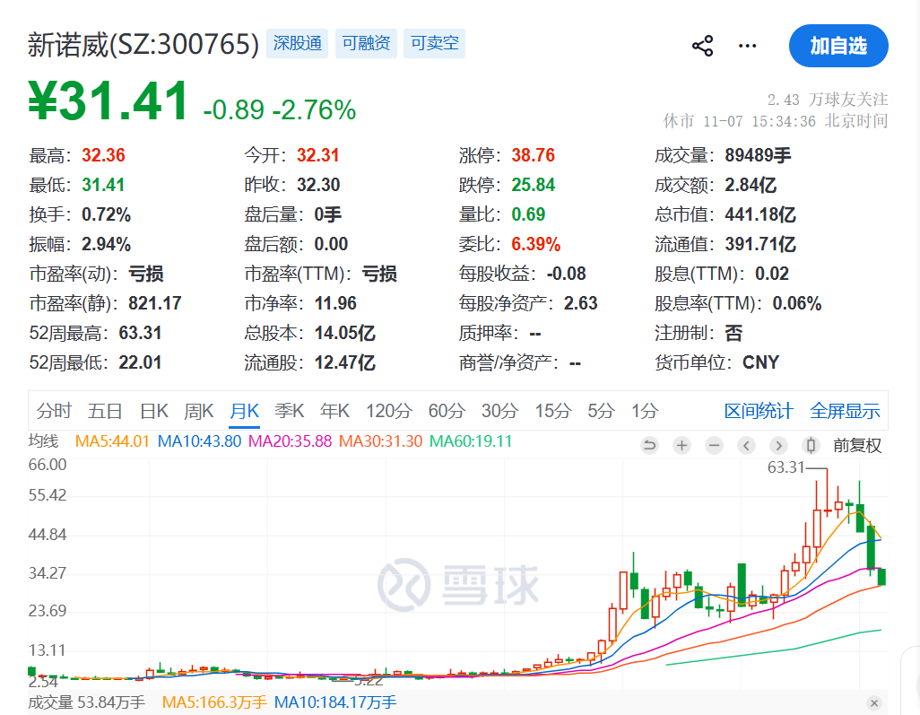 11月7日,新诺威最新收盘价31.41元,下跌2.76%,而且还看不出止跌的态势。