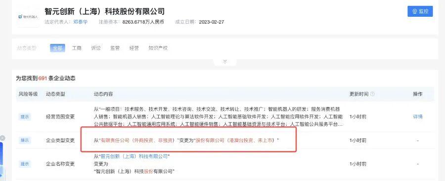 21世纪经济报道记者今日(11月10日)从天眼查获悉,智元机器人关联公司智元创新(上海)科技有限公司发生工商变更,企业名称变更为智元创新(上海)科技股份有限公司(下称“智元创新”),同时企业类型由有限责任公司(外商投资、非独资)变更为股份有限公司(港澳台投资、未上市)。