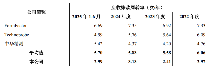 招股书显示,2022年至2025年上半年,强一股份应收账款周转率分别为2.97次/年、2.41次/年、3.13次/年、2.99次/年,同一时期内行业均值分别为6.06次/年、5.58次/年、5.83次/年、5.70次/年。