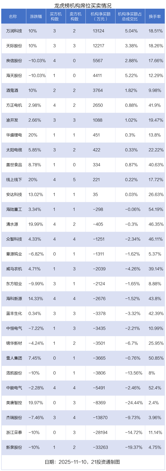 其中,机构净买入金额最多的是万润科技(002654.SZ),当日收盘上涨10%,换手率为18.51%。