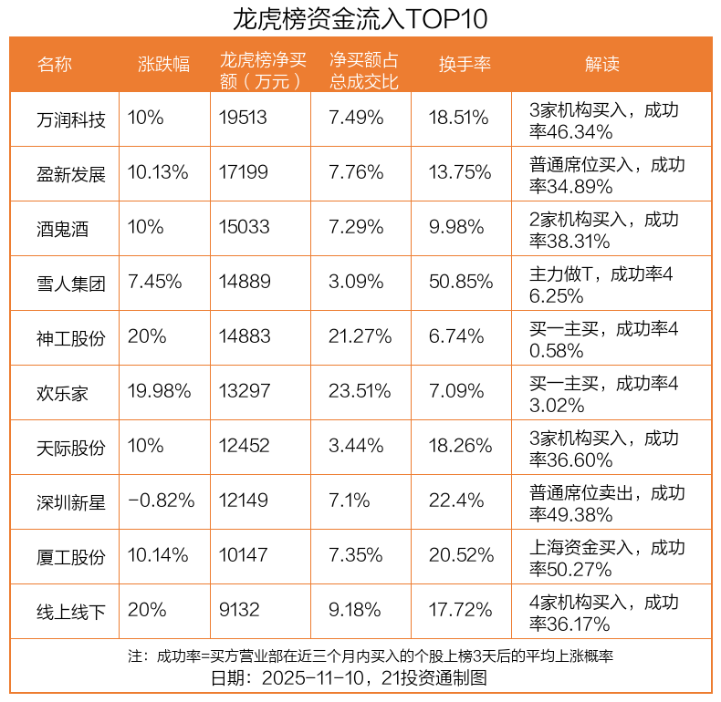 11月10日,上证指数上涨0.53%,深证成指上涨0.18%,创业板指下跌0.92%。盘后龙虎榜数据显示,共有56只个股因当日异动登上龙虎榜,资金净流入最多的是万润科技(002654.SZ),达1.95亿元。