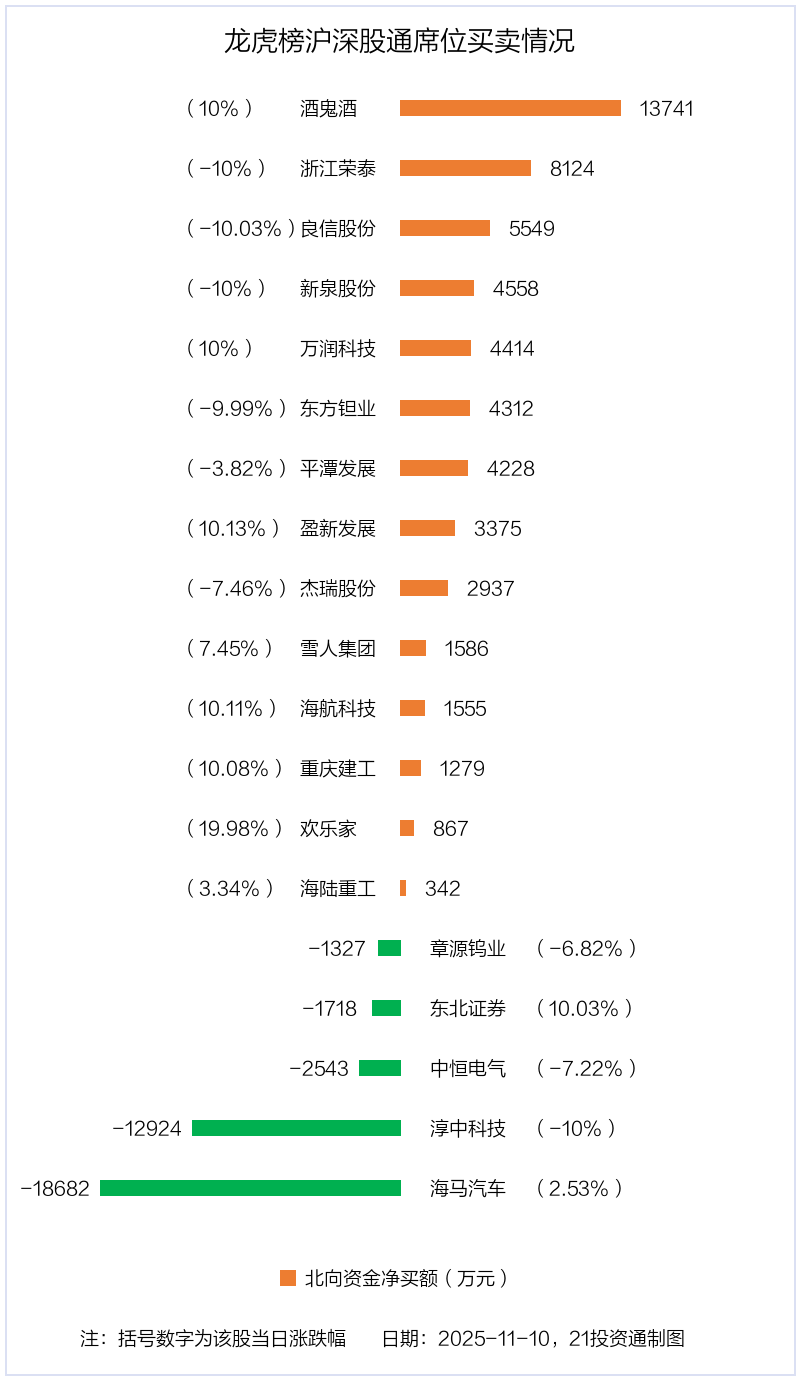 北向资金净买入金额最多的是酒鬼酒(000799.SZ),净买入1.37亿元,占总成交金额的6.66%。净卖出金额最多的是海马汽车(000572.SZ),为1.87亿元,占总成交金额的2.67%,当日收盘上涨2.53%,换手率为40.28%。