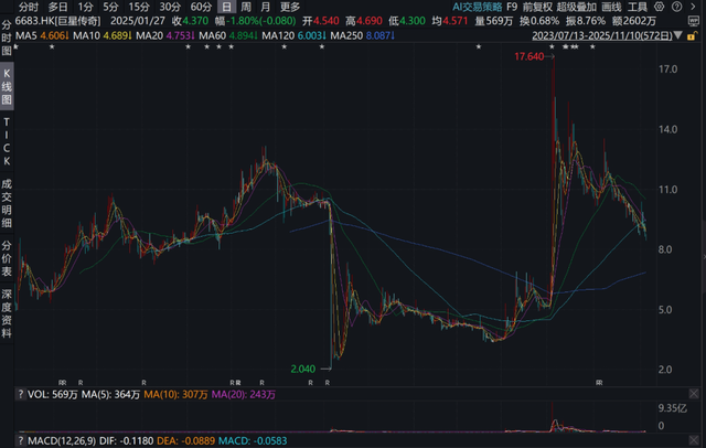 截至11月10日收盘,巨星传奇股价报8.41港元/股,下跌3.11%,总市值75亿港元。