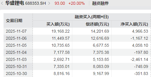 11月5日以来,华盛锂电的融资买入金额显著提升,从11月4日的0.7亿元迅速提升至11月7日的1.9亿元,并伴随着公司整体融资余额创出阶段性新高。