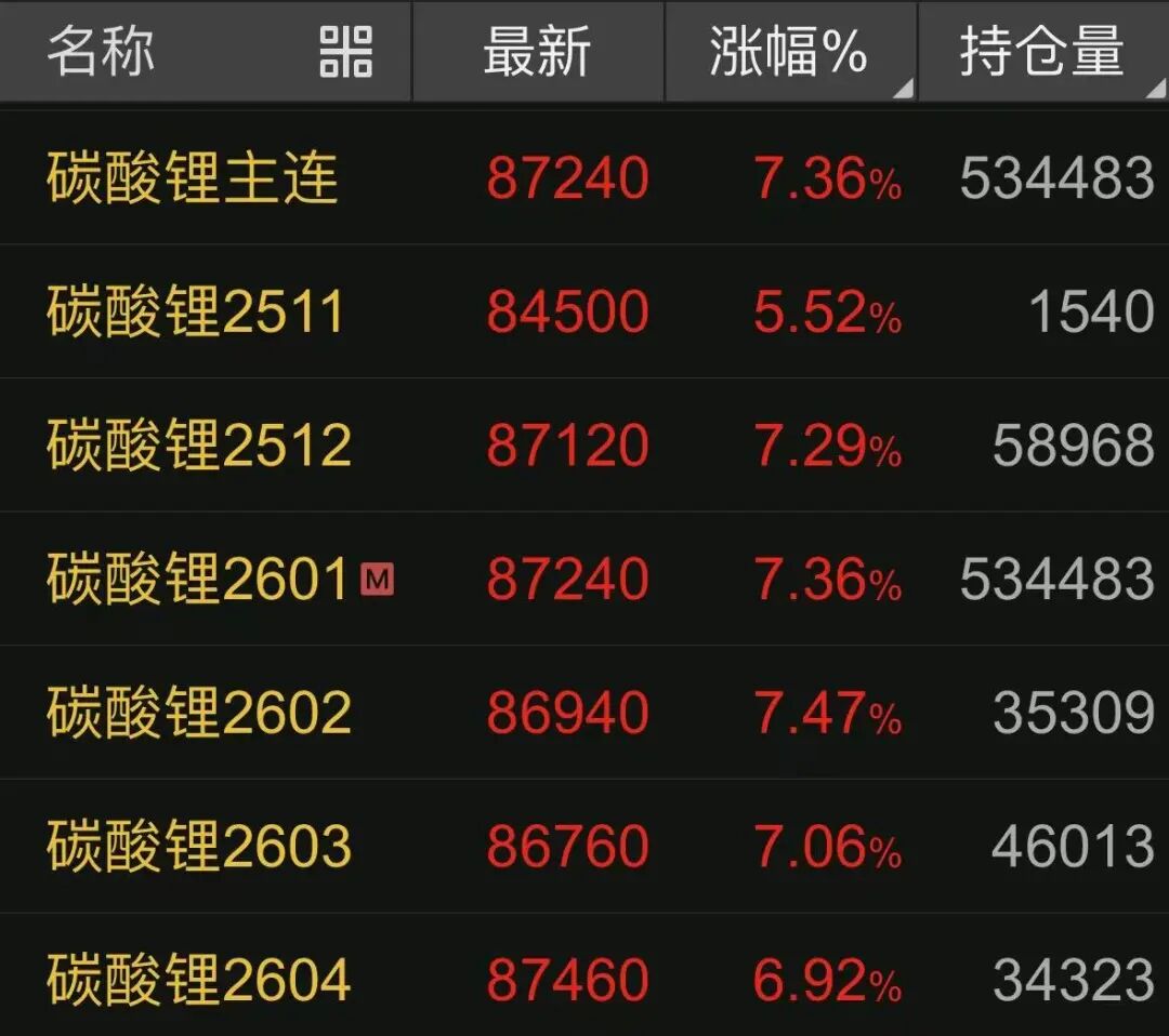 11月10日,多个碳酸锂期货合约涨幅超过7%,其中主力2601合约全天涨幅达到7.36%;碳酸锂现货价格,最新价也已经回升至8.1万元/吨附近,逼近今年8月下游旺季时8.5万元/吨的年内高点。