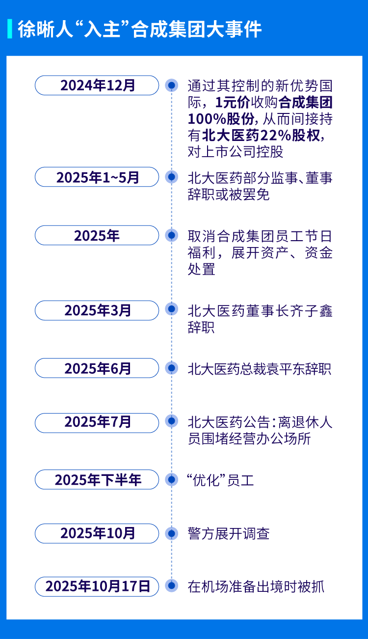 2024年12月,徐晰人通过其控制的新优势国际,以1元象征性价格,收购了方正商业管理持有的合成集团100%股权,从而间接控制了集团旗下上市公司北大医药。与此同时,新优势国际以3300万元的对价,接手了方正系对合成集团及其下属公司享有的高达23.92亿元的债权。