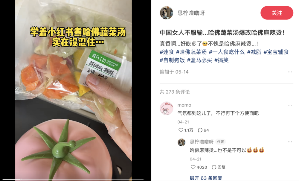如今,在盒马、叮咚买菜等一系列生鲜超市都有“哈佛蔬菜汤”的净菜售卖,食材包总重均400g,包含洗净切好的胡萝卜、南瓜、卷心菜和洋葱,售价在9.39-9.5元/份,销量和复购率都不低,可见大家对健康的需求有多迫切。