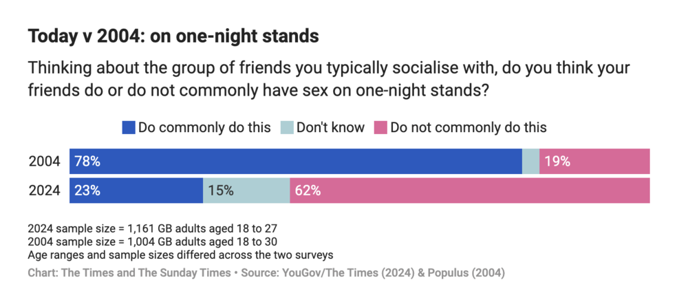 2025年,《泰晤士报》与YouGov合作,对1000多名年轻人进行了民意调查。调查结果显示,约62%的Z世代表示,他们不经常发生一夜情。只有约23%的人表示有过随意的性行为,这与《泰晤士报》在2004年对千禧一代的调查结果截然不同。当时,约19%的年轻人表示他们没有一夜情,而78%的人表示他们在第一次约会时就发生了性关系。