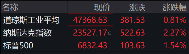 当地时间周一,美股三大股指尾盘冲高,道指涨近400点。截至收盘,道指涨0.81%,纳指涨2.27%,标普500指数涨1.54%。