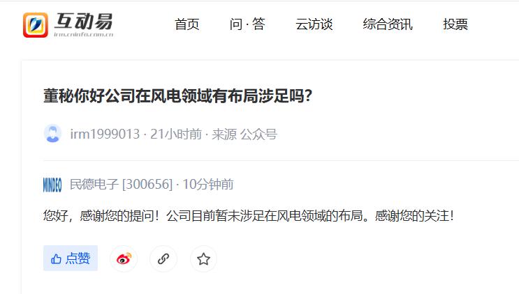 【V观财报丨民德电子:暂未涉足风电领域布局】民德电子11日盘前通过深交所互动易平台回答投资者提问称,公司目前暂未涉足在风电领域的布局。(中新经纬APP)