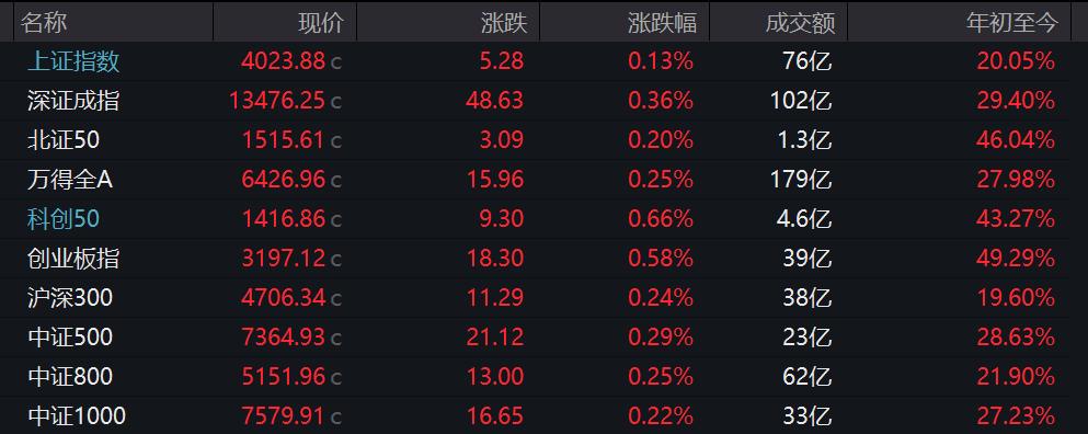 中新经纬11月11日电 11日,A股三大指数集体高开,上证指数涨0.13%,报4023.88点;深证成指涨0.36%,报13476.25点;创业板指涨0.58%,报3197.12点。