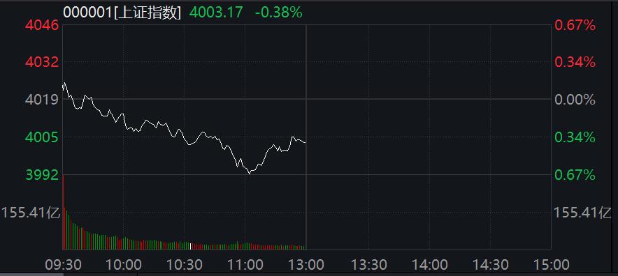 截至午盘,上证指数跌0.38%,报4003.17点;深证成指跌0.52%,报13357.43点;创业板指跌0.74%,报3155.29点。