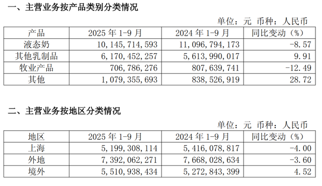 然而,自2004年被蒙牛反超之后,光明就彻底从“神坛”跌落,与蒙牛的差距越拉越大,营收更是只有千亿巨头伊利的零头,在2022-2024连跌3个财年之后,最新公布2025年三季度财报,仍充斥着几分寒意: