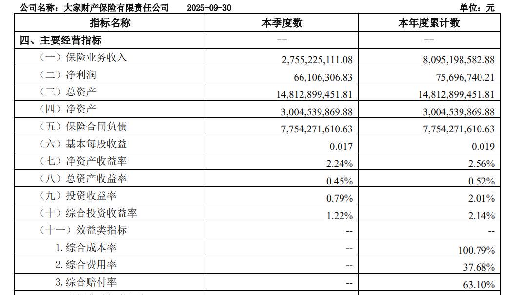 截至2025年前三季度,大家财险实现保费收入80.95亿元,净利润7569.67万元,综合成本率为100.79%。