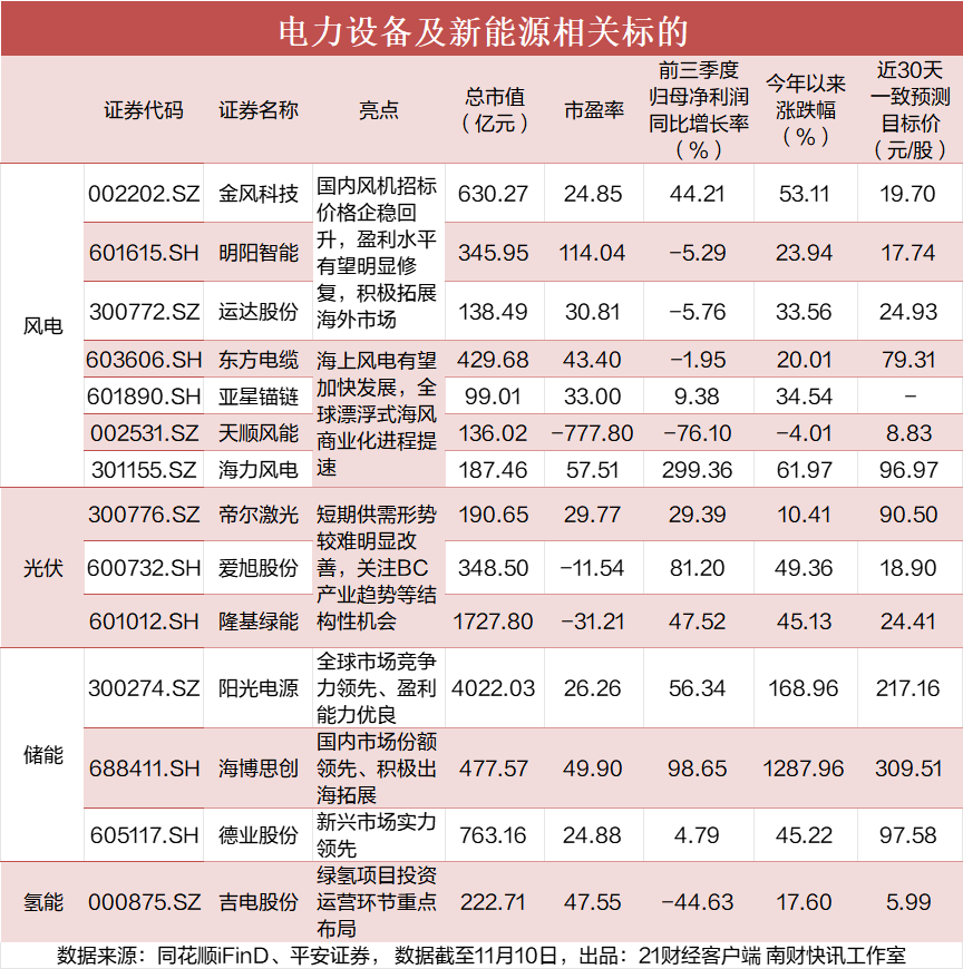 平安证券分析,风电方面,国内风机招标价格企稳回升,后续风机企业盈利水平有望明显修复,同时风机企业积极拓展海外市场,建议重点关注金风科技、明阳智能、运达股份;国内深远海海上风电有望加快发展,全球漂浮式海风商业化进程提速,建议重点关注东方电缆、亚星锚链、天顺风能、海力风电等;光伏方面,短期供需形势较难明显改善,建议关注BC产业趋势等结构性机会,相关标的包括帝尔激光、爱旭股份、隆基绿能等;储能方面,国内独立储能收益模式成型,海外非美大储市场机遇可期,推荐全球市场竞争力领先、盈利能力优良的阳光电源;国内市场份额领先、积极出海拓展的海博思创;新兴市场户储和欧洲工商储需求依然向好,推荐新兴市场实力领先的德业股份。氢能方面,关注在绿氢项目投资运营环节重点布局的企业,建议关注吉电股份。