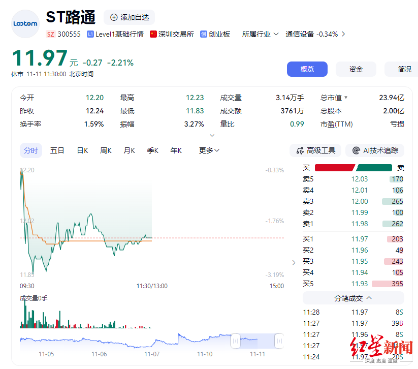 从业绩上看,ST路通目前已连亏四年,且亏损金额持续增加,2021年—2024年净利润分别亏损1626万元、1880万元、3445万元、5810万元。今年前三季度,公司营业收入为6291.9万元,同比减少26.68%;归属于上市公司股东的净利润为-36269万元,同比增加1.25%。