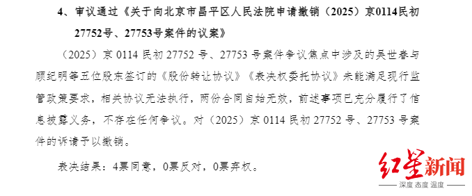 不过,11月7日召开的董事会,通过了撤销上述诉讼的议案,理由在于:案件争议焦点中涉及的吴世春与顾纪明等五名股东签订的《股份转让协议》《表决权委托协议》,未能满足现行监管政策要求,相关协议无法执行,两份合同自始无效,前述事项已充分履行了信息披露义务,不存在任何争议。