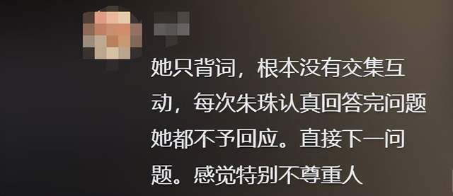 还有朱珠明明对她提问的每个问题都进行了延伸回答,她却只是按设定问题走流程,完全没有互动,就仿佛一个人形提词器。