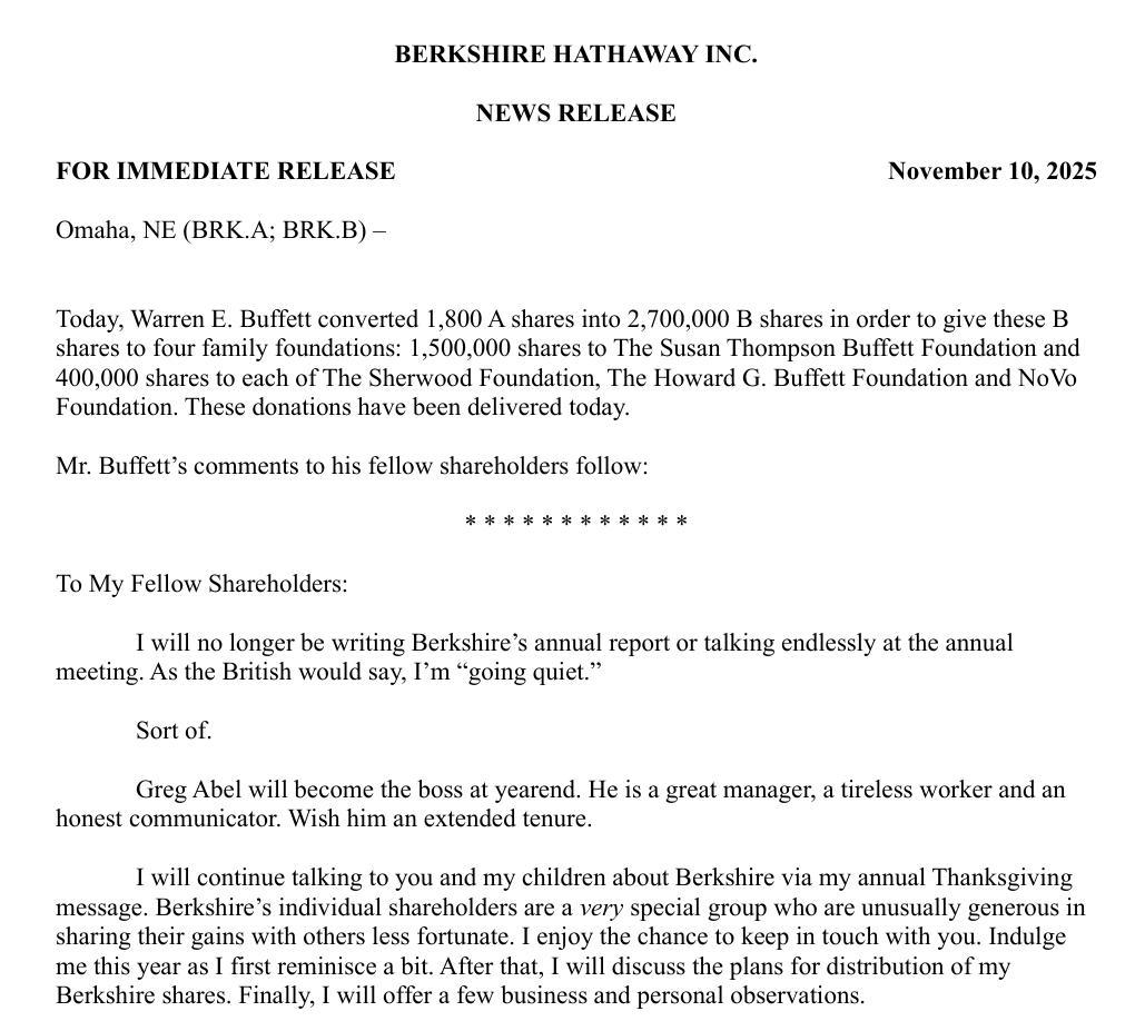 巴菲特在信函开头写道:“我将‘走向沉寂’。差不多是这样。”巴菲特称,在年底格雷格·阿贝尔(Greg Abel)将接任CEO,“他是一位出色的管理者、不知疲倦的工作者,也是一个诚实的沟通者。”巴菲特还称,将不再撰写伯克希尔年度报告,也不再在年度大会上讲话。