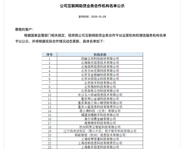 10月29日,中原消金还公布了助贷业务合作机构名单,包括百融云创、北海北极光、快手、五八同城、度小满、蚂蚁智信等55家公司,其中23家为融担公司。