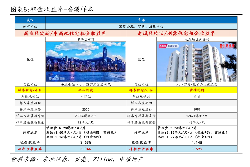 以香港为例,中高端住宅选取了中西区中环地区的半山捌號为样本,样本房屋每平方尺售价23806港元,租金每平方尺每月72港元,对应租金收益率约3.63%。老旧住宅选取了九龙城区必嘉街的黄埔花园为样本,样本房屋每平方尺售价12471港元,租金每平方尺每月43港元,对应租金收益率约4.14%。