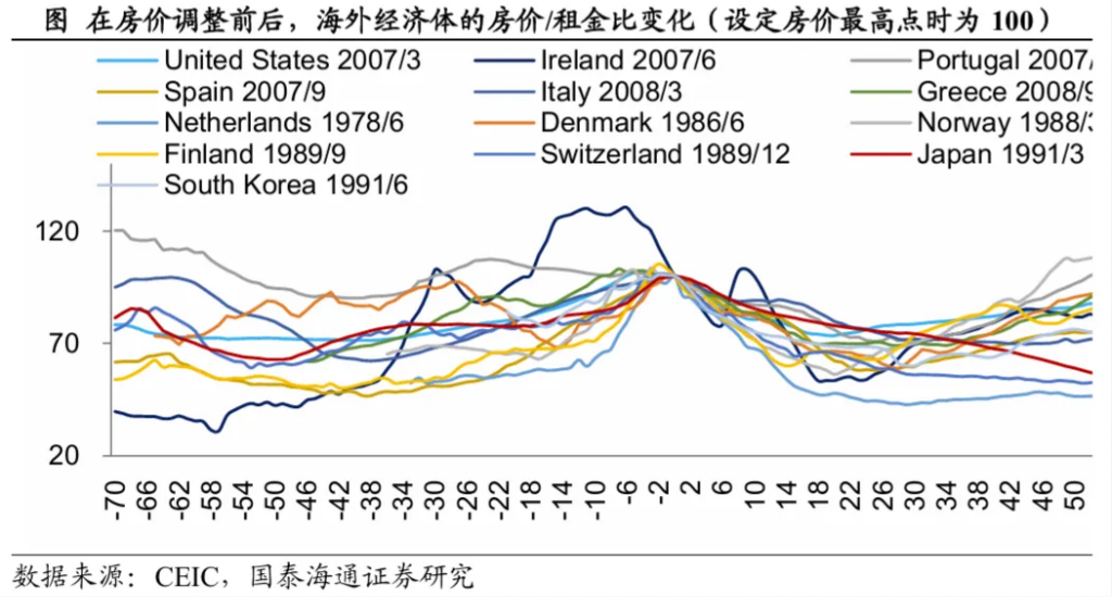 梁中华团队研究了13个经济体的房地产危机,发现它们有一个共同的规律:一旦房价进入调整周期,房子的估值往往会回到历史的估值低位,即租金回报率会回到历史最高位。这一规律和股票市场的规律是一致的。